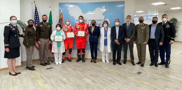 Una dimostrazione di professionalità e organizzazione che non è passata inosservata ai vertici del comando statunitense di stanza a Vicenza. Così, nella giornata di mercoledì una delegazione dell’esercito americano ha voluto ringraziare un gruppo di operatori sanitari.