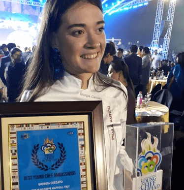 Dal Veneto all’India, regina degli chef mondiali: Giorgia Ceccato, 19enne di Santa Giustina in Colle, è stata eletta miglior giovane chef “ambasciatrice” alle Olimpiadi dei cuochi svoltesi in India. Giorgia studia a Castelfranco, ha 19 anni e risiede a Santa Giustina in Colle (Padova) e non è nuova a risultati di prestigio visto che è anche campionessa degli istituti alberghieri d’Italia nonché medaglia d’oro europea per il Finger Food. Questa volta però è sul tetto del mondo insieme ad una ventina di coetanei da ogni continente, con la medaglia olimpica, ottenuta grazie ai suoi piatti made in Italy che hanno conquistato la giuria di esperti internazionali.