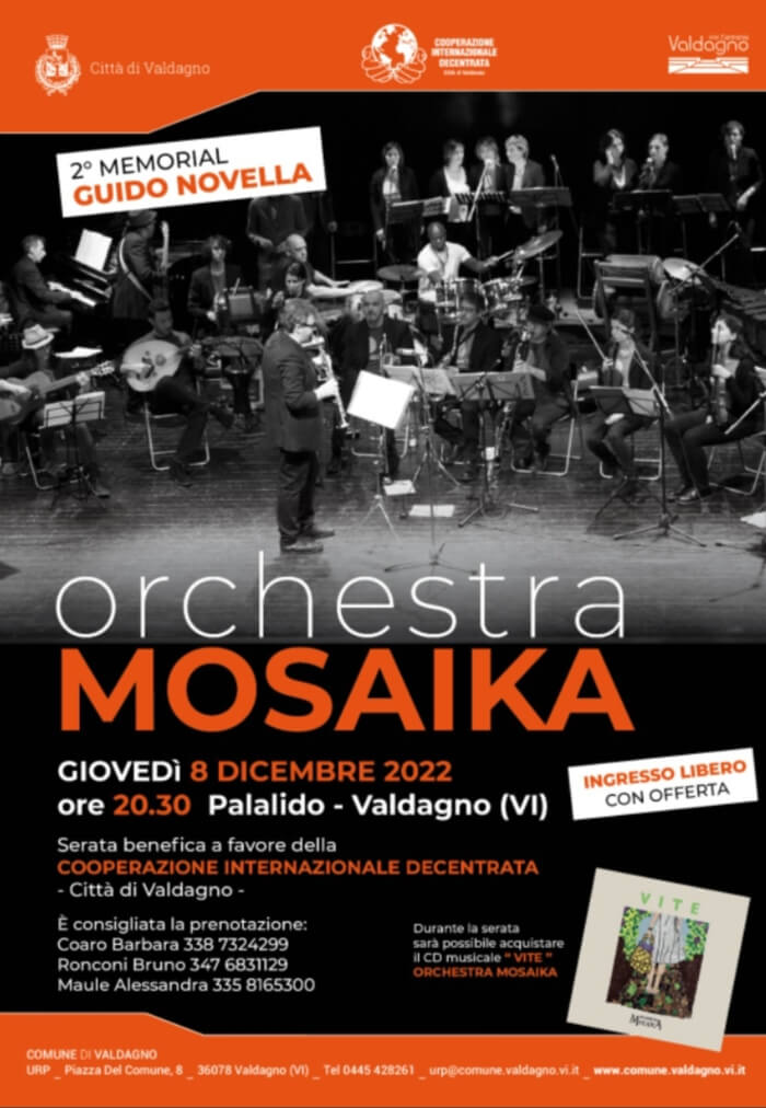 Giovedì 8 dicembre il Palalido di Valdagno ospiterà il secondo Memorial dedicato a Guido Novella, medico, consigliere comunale e anima del volontariato valdagnese scomparso nell’ottobre del 2020. Per ricordarlo il Comune di Valdagno e il Comitato per la Cooperazione Internazionale Decentrata Città di Valdagno organizzano anche quest’anno una serata benefica che vedrà salire sul palco l’Orchestra Mosaika per un concerto dai ritmi multietnici. L’appuntamento, con inizio alle 20.30, è a ingresso libero con offerta che andrà a sostegno dei progetti di sviluppo aiutati dalla onlus valdagnese.L’Orchestra Mosaika è una formazione multiculturale nata nel 2014 per creare un dialogo aperto tra diverse culture attraverso la musica, la danza e il canto corale. Mosaika è un porto aperto dove sono approdati e dal quale sono salpati musicisti provenienti da ogni angolo del pianeta con l’intenzione di mettere in comune e condividere le proprie esperienze e il proprio sapere. Dalla sua fondazione a oggi, nell’orchestra si sono avvicendati musicisti algerini, giapponesi, sudamericani, australiani, romeni, marocchini, armeni, srilankesi e naturalmente italiani. Da questo mosaico di provenienze geografiche e di esperienze differenti si sviluppa un’orchestra che promuove l’incontro e il dialogo creativo fra repertori delle più diverse tradizioni musicali.