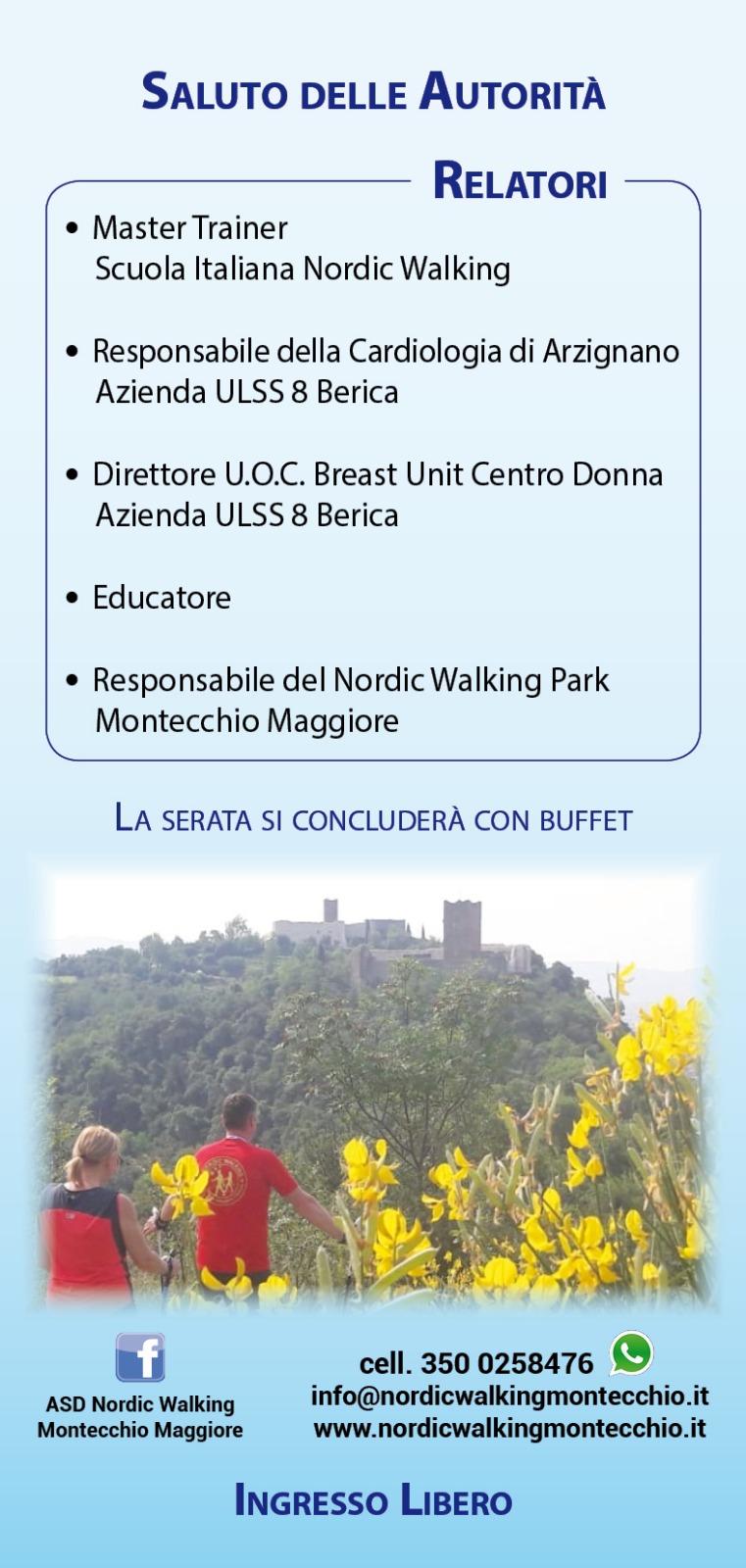 Venerdì 29 marzo alle ore 20:30 presso la Sala Civica Corte delle Filande di Montecchio Maggiore, l’ associazione sportiva dilettantistica Nordic Walking con sede a Montecchio Maggiore in collaborazione con A.N.D.O.S e ULSS 8 Berica, con il patrocinio del comune di Montecchio Maggiore, organizza un’interessante serata aperta liberamente alla cittadinanza con l’intenzione di promuovere questa disciplina sportiva, sempre più apprezzata, salutare e socializzante e per offrire anche qualcosa in più a tutti i camminatori. I benefici di una passeggiata con i bastoncini sono molteplici: la camminata permette l’abbassamento della pressione arteriosa, mantiene il cuore in salute, rilassa corpo e mente, aiuta a perdere peso ed è salutare e anti stress. La serata sarà moderata dalla giornalista Antonella Fadda e interverranno diversi relatori.