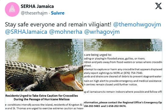 La Southeast Regional Health Authority (SERHA) – competente per Kingston, Saint Andrew, Saint Thomas e Saint Catherine – ha avvertito la popolazione della possibile presenza di coccodrilli nelle aree residenziali, a causa dell’innalzamento dei livelli dei fiumi e delle paludi. “L’acqua alta nei fiumi, nei burroni e nelle zone umide potrebbe spingere i coccodrilli verso la terraferma”, ha spiegato l’agenzia, invitando i residenti a rimanere vigili e ad evitare le aree allagate.
