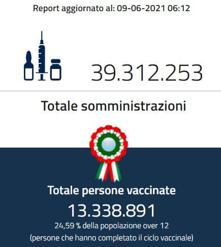 Ecco i dati aggiornati alle ore 8 di mercoledì 9 giugno relativo alle vaccinazioni in Italia.