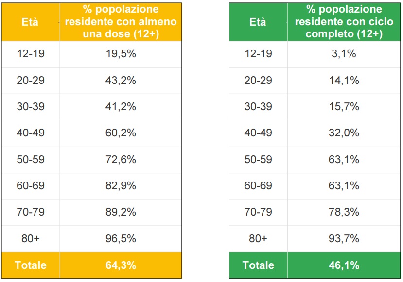 La preoccupazione risiede soprattutto sulla fascia 60-69 dove quasi una persona su cinque non ha ricevuto nemmeno una dose. Tale fascia è, come quelle più alte, più fragile di fronte alla diffusione della variante Delta.