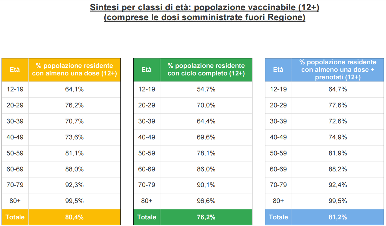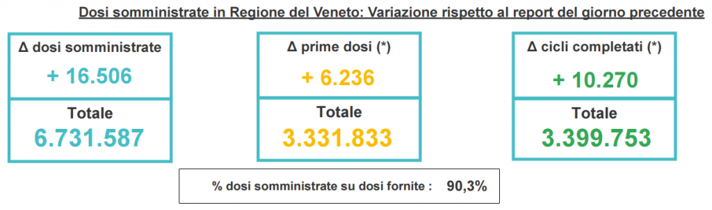 Prosegue la campagna vaccinale in veneto. Ieri somministrate 16.506 dosi. La media delle vaccinazioni è inferiore a quella nazionale. La popolazione residente che ha ricevuto almeno una dose ha raggiunto il 72,5% contro il 75% italiano. Per quanto riguarda le fasce d’età, le più lente sono la fascia 30-39 e 40-49 con una percentuale di vaccinati e prenotati inferiore al 75%