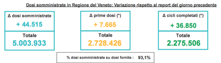 “Anche oggi sono stati somministrati 44.515 vaccini – conclude il Presidente Zaia – ricordo l’invito a vaccinarsi: da qui all’8 settembre ci sono ancora 270.000 posti liberi a disposizione di chi ancora non si è vaccinato. La macchina vaccinale del Veneto funziona ed è un vero successo di squadra”.