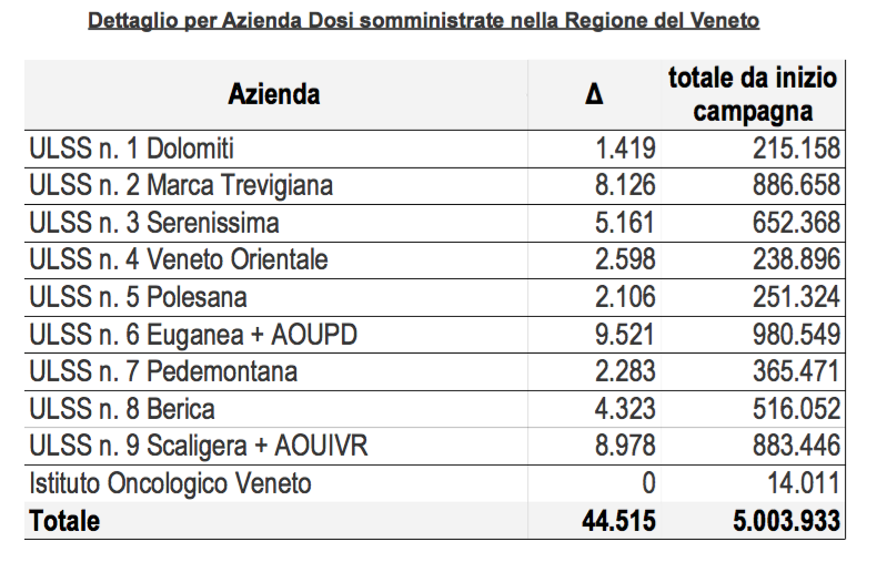 Vaccini, il Veneto supera quota 5 milioni di dosi somministrate