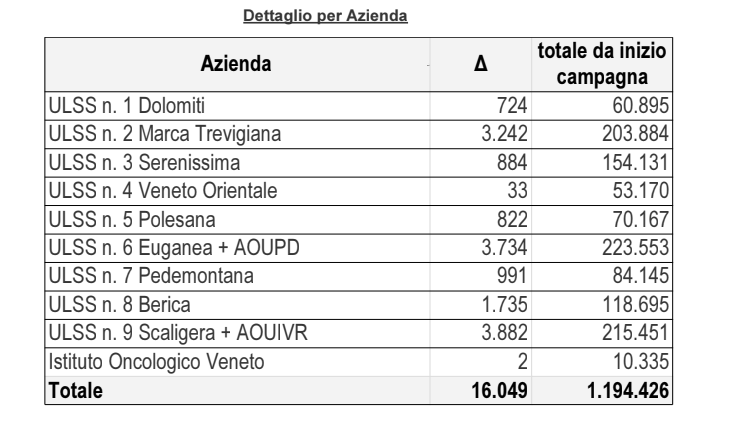 Il bollettino quotidiano regionale sull’andamento delle vaccinazioni in Veneto, Ulss per Ulss.