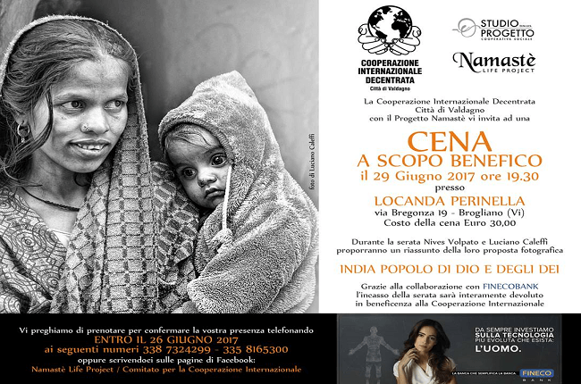 La prima occasione per incontrare l’India è una cena benefica in programma il 29 giugno alle 19.30 alla Locanda Perinella, con la mostra fotografica “India popolo di Dio e degli Dei” di Luciano Caleffi e Nives Volpato.