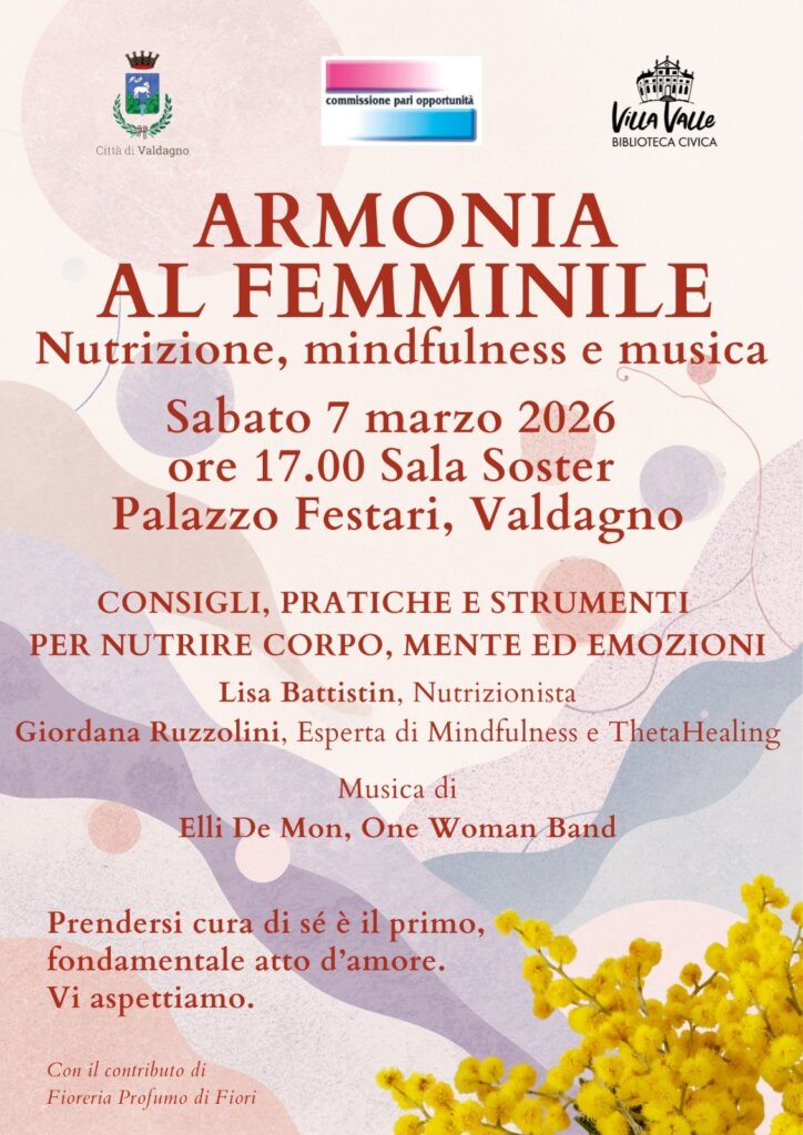 Valdagno – La cura, come attenzione verso di sé, corpo e spirito, verso le proprie aspirazioni e vocazioni, verso le relazioni. È questo il filo conduttore del programma dedicato alla Giornata Internazionale della Donna 2026, che si apre venerdì 6 marzo a Valdagno. Un filo che connette linguaggi e approcci diversi – arte, cinema, musica, nutrizione, mindfulness, salute e prevenzione – per ricordare che il benessere femminile è un valore sociale, culturale e comunitario. La rassegna, coordinata e promossa dalla Commissione Pari Opportunità del Comune di Valdagno, è resa possibile grazie alla partecipazione di associazioni e realtà culturali del territorio: la Biblioteca Civica Villa Valle, ProValdagno, il Cinema Teatro Super, il Centro Servizi Sociali Villa Serena.