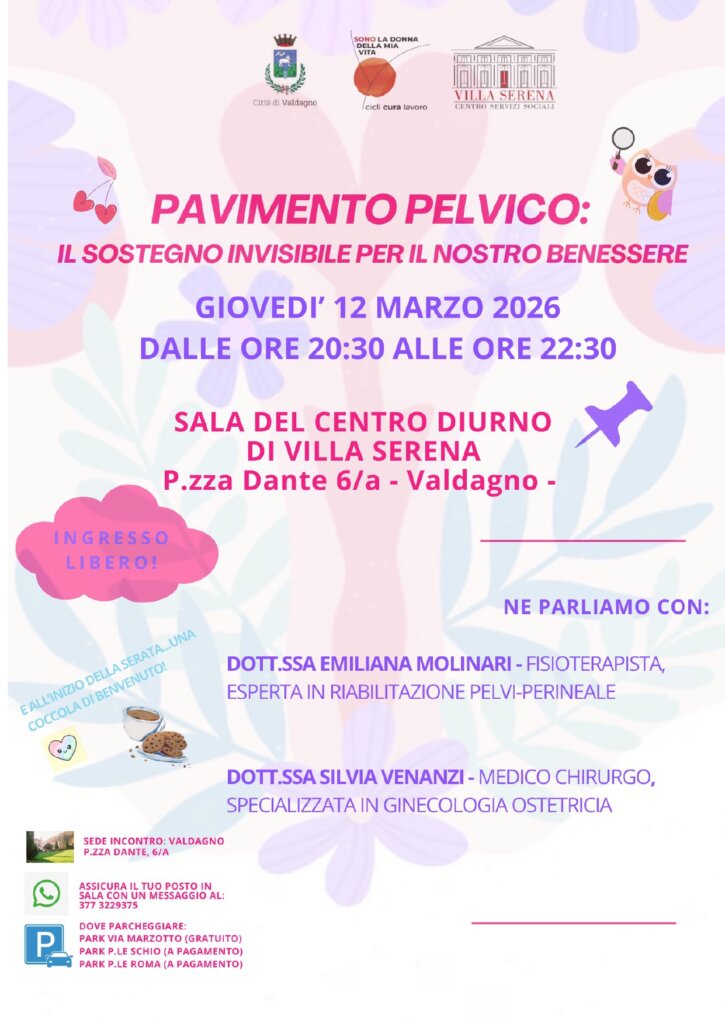 A chiudere la rassegna, giovedì 12 marzo alle 20.30 nella Sala del Centro Diurno di Villa Serena, sarà l’incontro “Il pavimento pelvico: il sostegno invisibile per il nostro benessere”, un momento informativo dedicato a un tema fondamentale per la salute femminile. L’iniziativa offre un contributo significativo di prevenzione e sensibilizzazione con l’obiettivo di promuovere consapevolezza, conoscenza e autonomia. Intervengono Emiliana Molinari, fisioterapista esperta in riabilitazione pelvi-perinale, e Silvia Venanzi, medico chirurgo specializzata in ginecologia ostetricia. Serata a cura di Villa Serena.