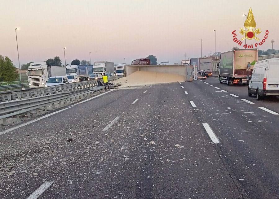 L’autotreno, che trasportava mais, si è adagiato su un fianco occupando tutte e tre le corsie e riversando parte del carico sulla carreggiata. Fortunatamente l’autista è uscito illeso dall’incidente.
