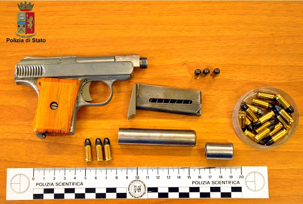 Gli operatori della Polizia di Stato, intervenuti nell’immediatezza del fatto, hanno rinvenuto nella disponibilità dell’uomo, più precisamente all’interno di un marsupio, una pistola di piccole dimensioni calibro 6,35 mm. priva di matricola, nonché 15 cartucce a palla delle medesime caratteristiche di quelle trovate all’interno dell’arma.