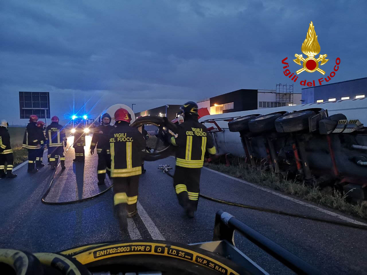 VENETO – Autocisterna con GPL si rovescia: vigili del fuoco al lavoro da ore (foto e video)
