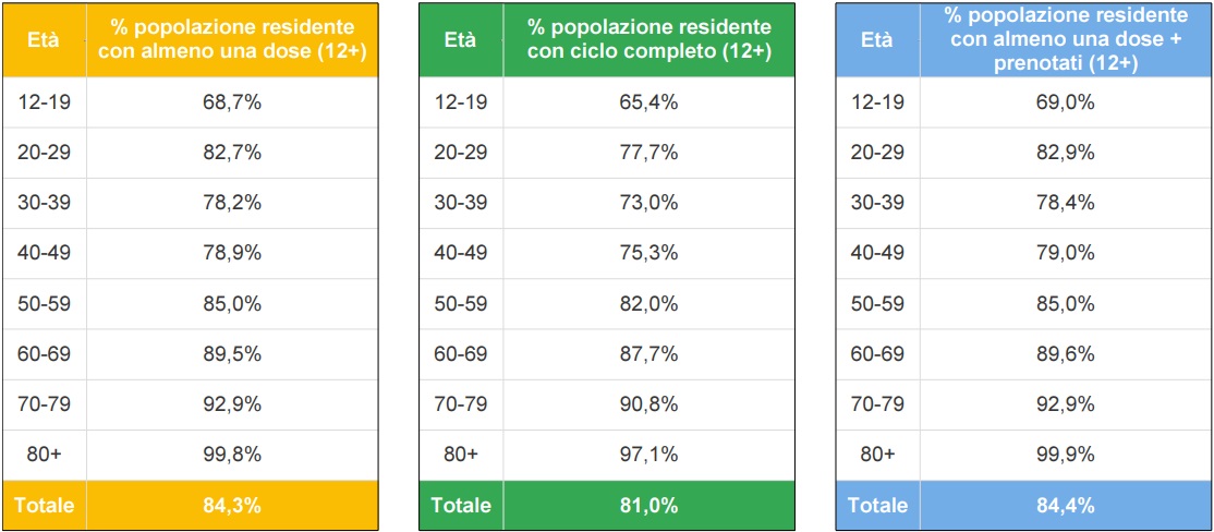 In base ai dati per fasce d’età vi è stata un’ottima risposta alle vaccinazioni dei 12-19enni, i meno a rischio. 7 su 10 sono vaccinati almeno con una dose.