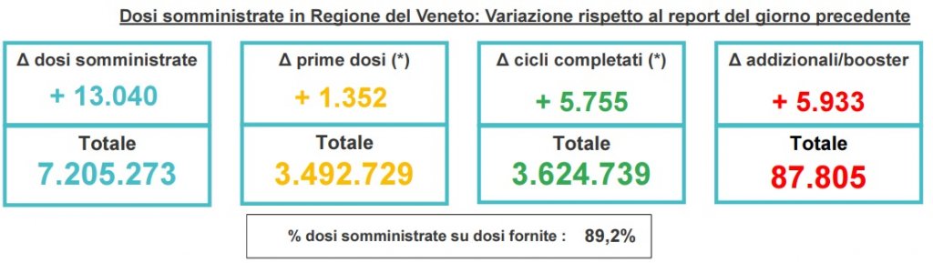 Mentre arrivano le avvisaglie della quinta ondata in Veneto, con aumento dei contagi e con i Paesi ad Est in piena emergenza, prosegue la campagna vaccinale (nelle ultime ore più di 500 nuovi contagi, aumento degli attualmente positivi da qualche giorno e terapie intensive in leggero aumento). Fortunatamente, grazie alla campagna di vaccinazione, gli effetti di questi aumenti sono decisamente minori rispetto allo scorso anno.