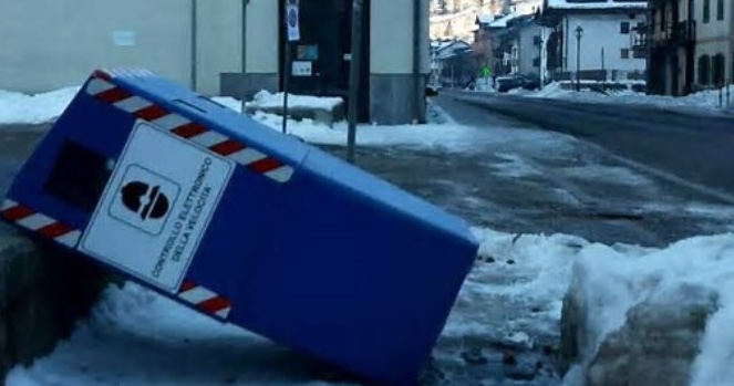 In questo caso è bastato svitare i bulloni e far sbilanciare contro la parete di un edificio vicino il contenitore blu posto a lato della strada, che comunque è vuoto al suo interno, e quindi in questo periodo non registra gli eccessi di velocità dei veicoli di passaggio.
