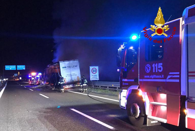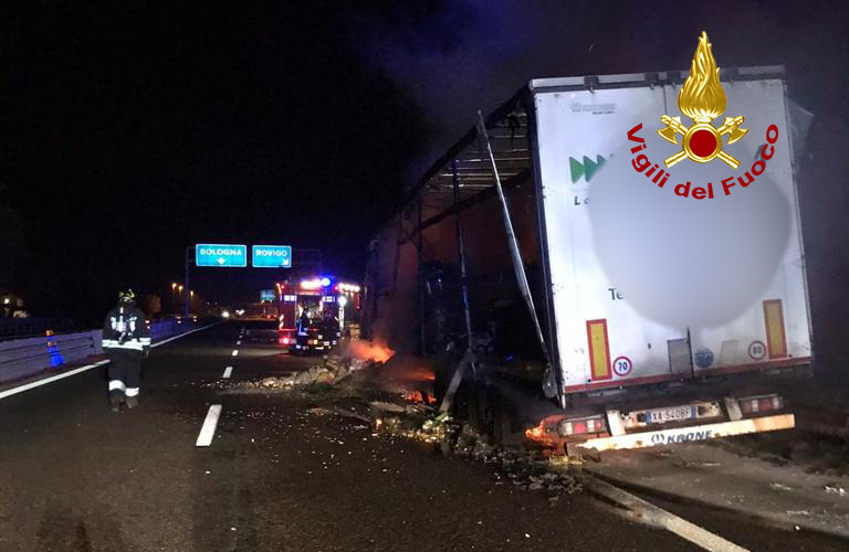 Martedì sera alle 21:15, i vigili del fuoco sono intervenuti in autostrada A13 poco prima dello svincolo per Rovigo in direzione Bologna per l’incendio di un autoarticolato: nessuna persona è rimasta ferita. I pompieri arrivati da Rovigo ed Este con 2 autopompe, 2 autobotti e 12 operatori hanno spento l’incendio già generalizzato dell’autoarticolato, carico di mangimi e prodotti alimentari. Sul posto la polizia stradale e il personale ausiliario di autostrada. Le cause dell’incendio probabilmente innescate dallo scoppio di uno pneumatico sono al vaglio dei tecnici dei vigili del fuoco. Durante le operazioni di soccorso il traffico autostradale rimasto bloccato. Le operazioni di completo spegnimento e raffreddamento del mezzo sono terminate alle 2:30 della notte scorsa.
