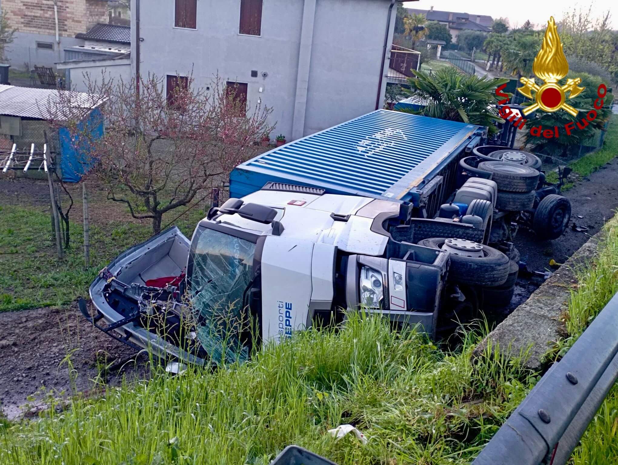 Stamattina poco prima delle 5 i vigili del fuoco sono intervenuti lungo la SS 516 strada dei Vivai all’altezza dell’uscita di Sant’ Angelo di Piove di Sacco per un camion a rimorchio finito rovesciato, sotto il piano stradale. Illeso l’autista.  I pompieri accorsi da Piove di Sacco e Padova, hanno messo in sicurezza il mezzo e predisposto le operazioni per il successivo recupero da parte del soccorso stradale del mezzo pesante e del rimorchio. La circolazione lungo la strada dei Vivai in direzione Chioggia è rimasta interrotta durante le operazioni di recupero. Sul posto i carabinieri per i rilievi del sinistro e la deviazione del traffico.
