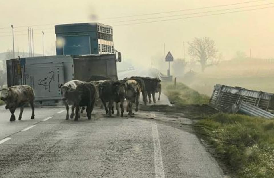 VENETO – Camion si ribalta: tori a spasso sulla Monselice-Mare