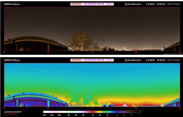 In entrambe è ben visibile l’inquinamento luminoso ma anche le intensità differenti: l’immagine ripresa dal monte Venda mostra un’ampia fascia del cielo con valori di luminanza tra 1 e 3 (circa 900% in più della luminosità naturale) mentre da Padova la corrispondente fascia di cielo ha valori di luminanza tra 5 e 15 (circa 5000% in più della luminosità naturale).
