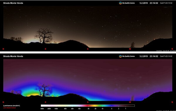 In entrambe è ben visibile l’inquinamento luminoso ma anche le intensità differenti: l’immagine ripresa dal monte Venda mostra un’ampia fascia del cielo con valori di luminanza tra 1 e 3 (circa 900% in più della luminosità naturale) mentre da Padova la corrispondente fascia di cielo ha valori di luminanza tra 5 e 15 (circa 5000% in più della luminosità naturale).