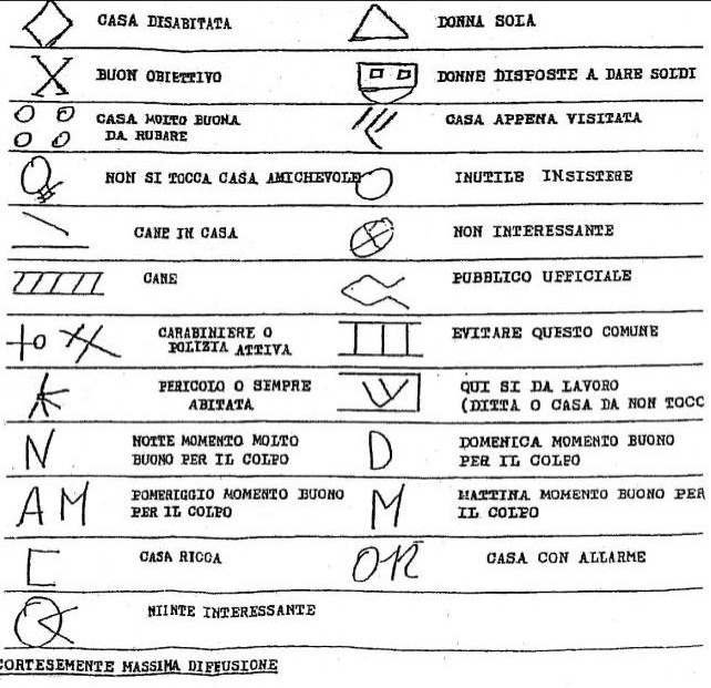 I segni sono quasi universali, tanto che il comando provinciale dei carabinieri di Reggio Emilia ha dato recentemente il via alla campagna “Aiutaci ad Aiutarti” con la realizzazione di un vademecum contenente i consigli e tutti i tipi di segni convenzionali dei ladri che qualsiasi cittadino può ottenere richiedendolo presso un comando dell’Arma di Reggio Emilia. Proprio a Reggio in queste ore i carabinieri stanno dando corso ad una decina di arresti (in prevalenza nomadi) di persone specializzate anche nei furti in appartamento.