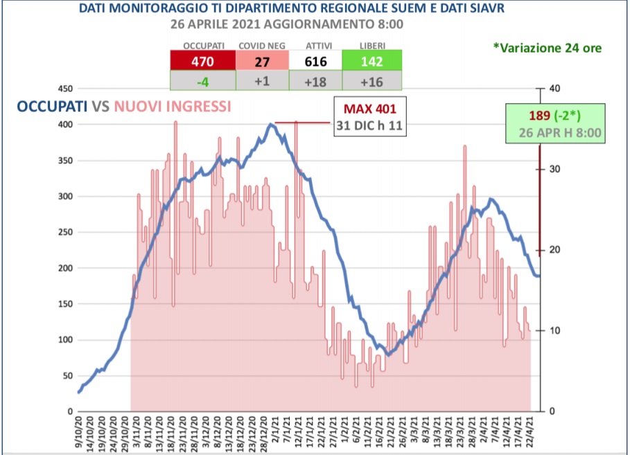 Nella prima tabella è indicato il punto massimo di occupazione raggiunto il 31 dicembre 2020 (401 ricoverati) e la curva che scende e poi risale fino ad un secondo picco agli inizi di aprile fino al dato del 26 aprile (189 posti occupati). In blu i ricoveri e in rosso i nuovi ingressi