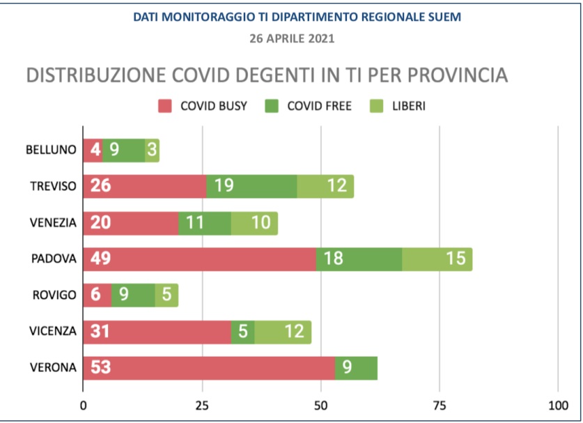 Ecco invece la distribuzione nelle diverse province del Veneto. Padova è la provincia con più ricoverati, seguono Verona, Treviso, Vicenza, Venezia, Rovigo e Belluno.