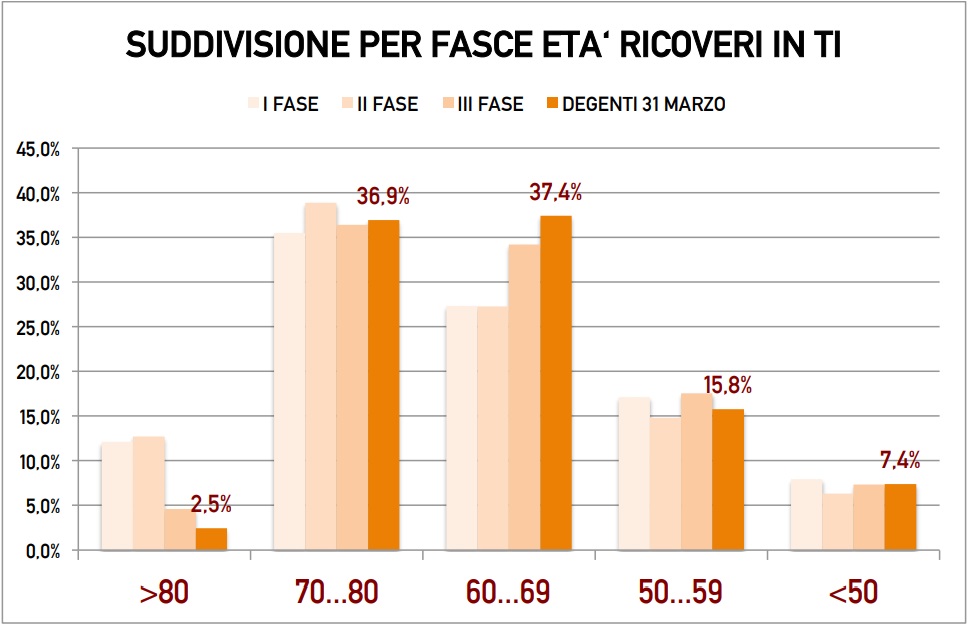 Il dato più eclatante emerge dalle fasce d’età dei ricoverati. E’ possibile notare il calo netto dei pazienti over 80. La sostanziale stabilità dei pazienti 70-80 (la cui vaccinazione è in corso e il netto aumento dei pazienti dai 60 ai 70 anni (la cui vaccinazione inizia domani)