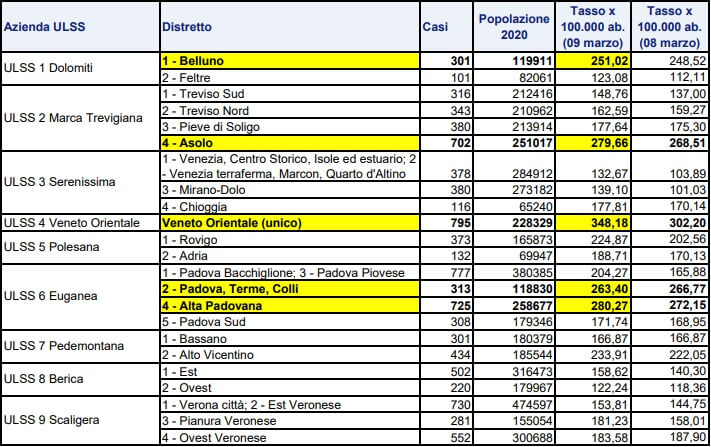 Ecco la tabella, aggiornata a oggi 9 marzo, sulla situazione dei contagi da Covid 19 nei distretti sanitari del Veneto.