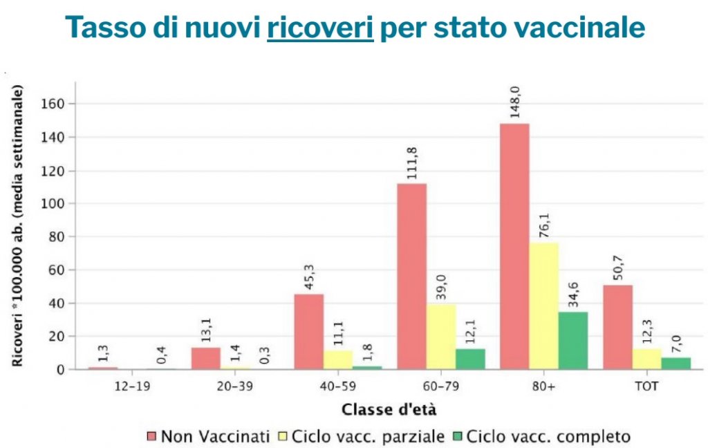 Ancora più eloquente la tabella sui ricoverati. In tutte le fasce d’età, pur rappresentando i no vax una minoranza, rappresentano la larga maggioranza dei ricoverati con dati significativi già a partire dai 40 anni di età.