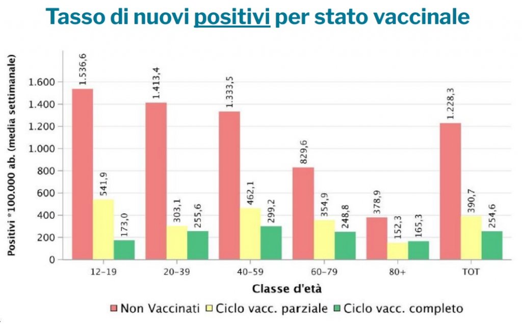 Per quanto riguarda i positivi si nota come i non vaccinati (in rosa) rappresentino la stragrande maggioranza dei contagiati in tutte le fasce d’età. Soprattutto come gli over 80 (fascia più coperta dai vaccini) sia la meno colpita. Nonostante fra gli over 80 i non vaccinati siano pochissimi, rappresentano la maggioranza assoluta dei contagiati.