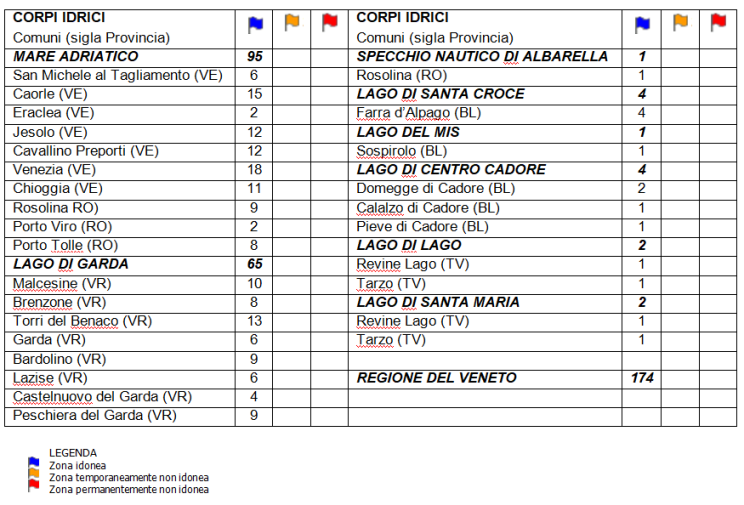 Sono 174 le acque di balneazione che compongono la rete regionale di monitoraggio della qualità delle acque di balneazione in Veneto per l’anno in corso, distribuite su otto corpi idrici per un totale di 149 Km di costa controllata adibita alla balneazione tra mare e laghi.