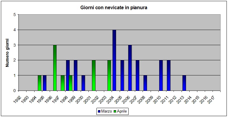 In aprile i casi diventano ovviamente più radi ma ancora possibili specie negli anni più lontani, 6 anni su 25, quasi tutti concentrati nei primi dieci anni della serie (dal 1992). L’episodio più recente e significativo risale al 6-7 aprile 2003 quando si registrarono accumuli in pianura e successive gelate con gravi danni in agricoltura. Curiosamente in quello stesso anno, proprio a partire dalla fine di aprile, si registrò una totale inversione di rotta con un’eccezionale sequenza di ondate di caldo che rese il 2003 l’anno con l’estate più calda degli ultimi 50 anni.