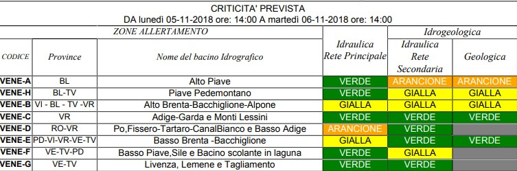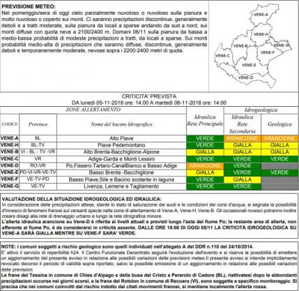 Permane lo stato di allerta ‘arancione’ nel Bellunese e nel basso Polesine, lungo il corso del fiume Po. Il Centro funzionale decentrato della Protezione civile del Veneto, viste le previsioni meteo e le precipitazioni attese per oggi pomeriggio e domani, più probabili e consistenti nelle aree montane rispetto alla pianura, ha dichiarato l’allerta per criticità idraulica e geologica per il bacino dell’Alto Piave, valida fino alle ore 14 di domani 6 novembre.