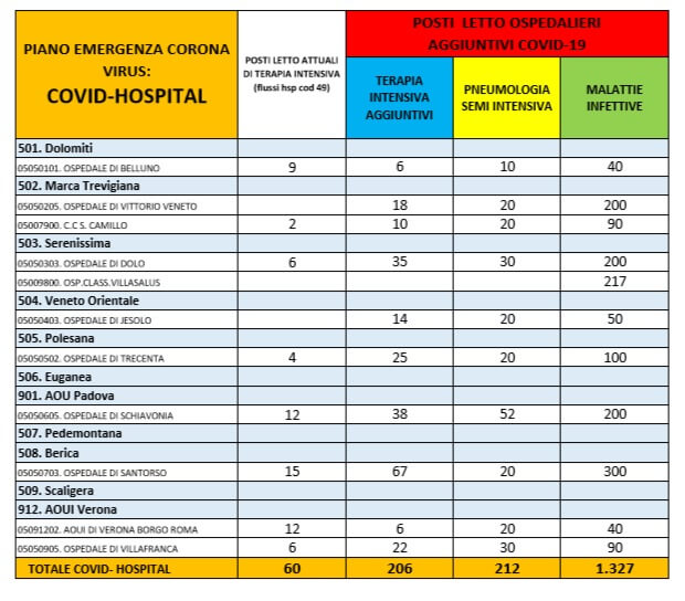 VENETO – Piano straordinario della Regione: gli ospedali-Covid19