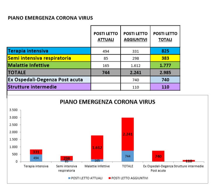 I posti letto totali, assommando quelli di terapia intensiva, terapia subintensiva e malattie infettive, passano da 744 a 2.985, dei quali 825 di Terapia Intensiva (a regime normale sono 494), 383 di Terapia Subintensiva Respiratoria (a regime sono 85), 1.777 di malattie infettive (a regime sono 165).