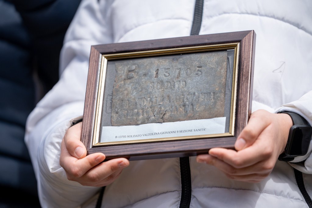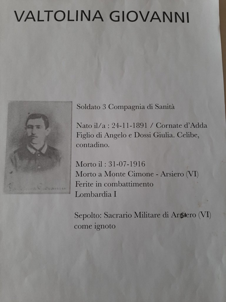 Tra queste la targhetta nominativa di Giovanni Valtolina di Monza. Nato il 24.11.1891 a Cornate d’Adda, è deceduto nel monte Cimone il 31.7.1916. Faceva parte della Compagnia di Sanità ed è stato colpito a morte con molta probabilità mentre andava a soccorrere i feriti durante il combattimento del 31 luglio. Il presidente Nardin ha consegnato la targhetta al pronipote Mattia, 12 anni, a significare l’eredità di coraggio e di valori lasciata da Valtolina e a necessità che i giovani ne siano fieri custodi.