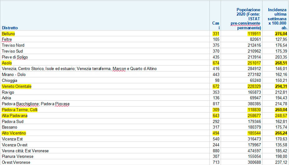 Nella tabella sotto, evidenziati in giallo, i distretti ‘rossi’ del Veneto, quelli in cui si superano i 250 contagi per 100.000 abitanti. Si tratta di Asolo, Belluno, Alto Vicentino, Veneto Orientale, Padova-Terme-Colli, Alta Padovana.
