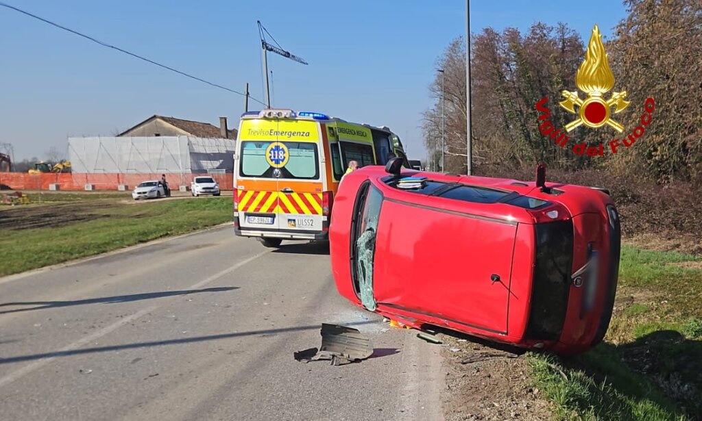 Incidente stradale questa mattina, giovedì 20 febbraio, in via Comarotta a Quinto di Treviso. Intorno alle 10:40, due auto si sono scontrate violentemente, con una delle vetture che si è ribaltata su un fianco e l’altra finita fuori strada in un campo agricolo.