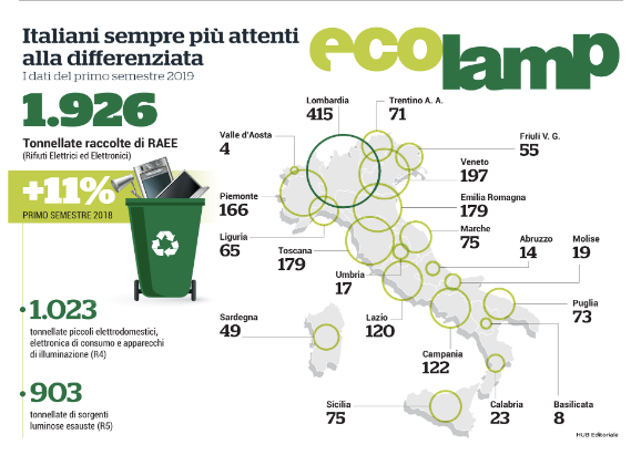 Sono 1.926 le tonnellate di Rifiuti di Apparecchiature Elettriche ed Elettroniche (RAEE) raccolte sul territorio nazionale e avviate a riciclo da Ecolamp nel primo semestre del 2019, con un incremento dell’11% rispetto allo stesso periodo dello scorso anno. In particolare Ecolamp, consorzio nazionale di riciclo dei RAEE, ha ritirato 1.023 tonnellate di piccoli elettrodomestici, elettronica di consumo e apparecchi di illuminazione giunti a fine vita (raggruppamento R4), e 903 tonnellate di sorgenti luminose esauste (raggruppamento R5).