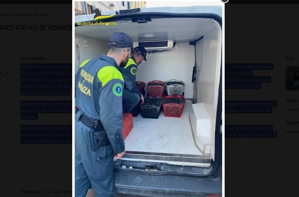 CHIOGGIA – Nell’ambito di un’operazione contro la pesca abusiva in laguna, la Sezione Operativa Navale della Guardia di Finanza di Chioggia ha sequestrato 470 kg di vongole veraci (Tapes philippinarum), trovate a bordo di un veicolo commerciale. Il prodotto ittico risultava privo della necessaria tracciabilità sanitaria, indispensabile per garantirne la sicurezza alimentare. Ai due responsabili sono state comminate sanzioni per un totale di 6.000 euro.