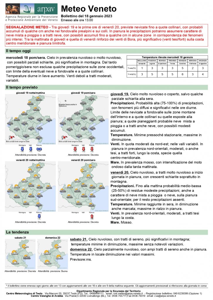 Il Centro Funzionale Decentrato della Protezione Civile della Regione del Veneto ha emesso oggi un avviso in cui si dichiara lo stato di attenzione, tra domani e le prime ore di venerdì 20 gennaio, per nevicate fino a quote collinari, con probabili accumuli di qualche centimetro anche nei fondovalle prealpini e sui colli.