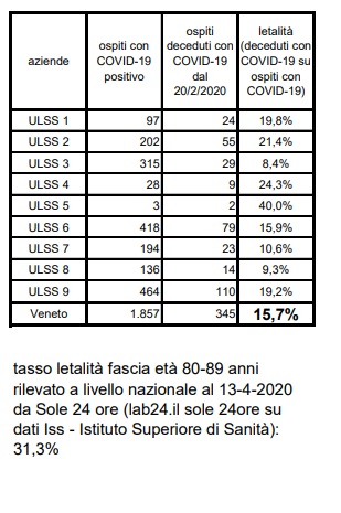 Ecco il quadro dei controlli effettuati ad oggi nelle RSA venete su ospiti e operatori da parte delle Ulss competenti per il territorio. Si unisce, inoltre, la tabella sul tasso di mortalità nella fascia 80-89 anni (fonte Sole 24 Ore).