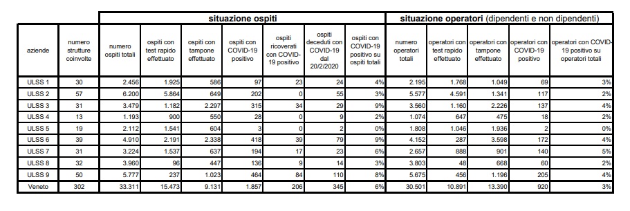 VENETO – Tamponi in case riposo – I risultati: 6% pazienti positivi, 3% operatori positivi