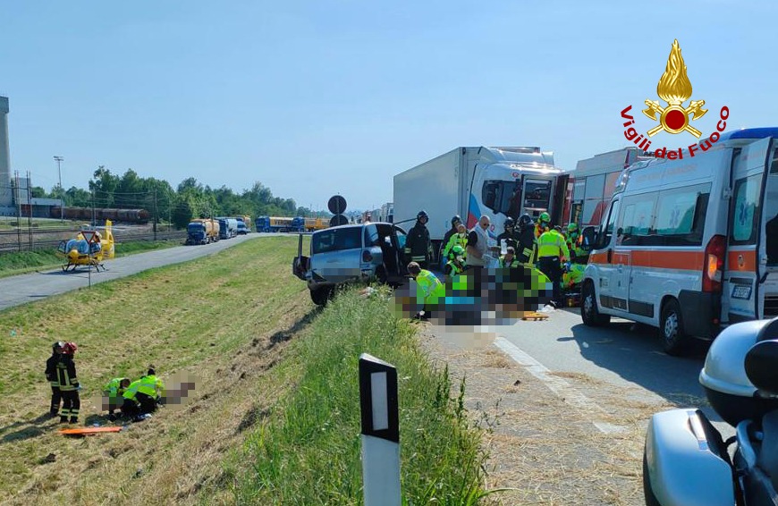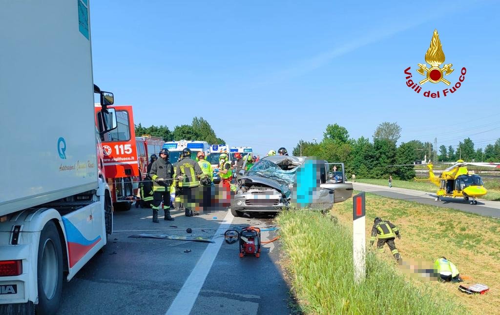 Da poco dopo le 16:00, i vigili del fuoco stanno operando lungo Via Postumia a San Pietro in Gù, Comune ai confini fra Padova e Vicenza, per un incidente frontale tra un’auto e un mezzo pesante: 2 persone decedute e 4 feriti in gravi condizioni, tutte di origine straniera. L’incidente è avvenuto all’altezza del mangimificio Veronesi. I pompieri arrivati da Cittadella e Bassano del Grappa, hanno messo in sicurezza i mezzi ed estratto i feriti dall’auto. Purtroppo nell’impatto due persone sono decedute sul colpo, come accertato dai sanitari del SUEM presenti sul posto con 4 autoambulanze e 2 elisoccorso. Gli altri tre feriti sono in fase di stabilizzazione da parte dei sanitari. Il traffico è bloccato nelle due direzioni. Sul posto le forze dell’ordine per i rilievi del sinistro e la deviazione del traffico.