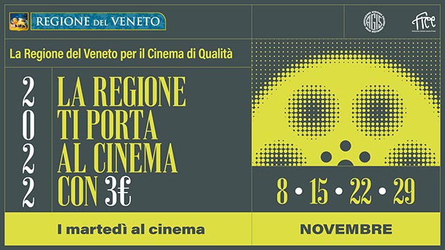 Dopo il successo riscontrato nei mesi di aprile e maggio, tornano nelle sale del Veneto a partire da martedì 8 novembre le proiezioni d’autore dell’edizione 2022 de “La Regione del Veneto per il cinema di qualità – La Regione ti porta al cinema con tre euro – I martedì al cinema”, progetto pluriennale della Regione del Veneto, realizzato in collaborazione con la Federazione Italiana Cinema d’Essai (FICE) delle Tre Venezie e l’Unione interregionale Triveneta AGIS.