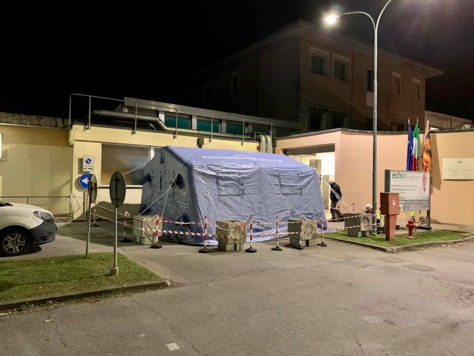 Nella foto: la tenda che fu allestita al Pietro Milani di Noventa Vicentina