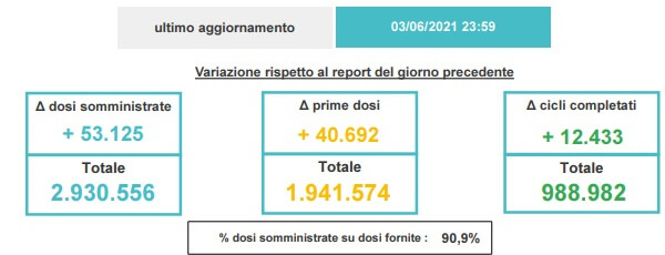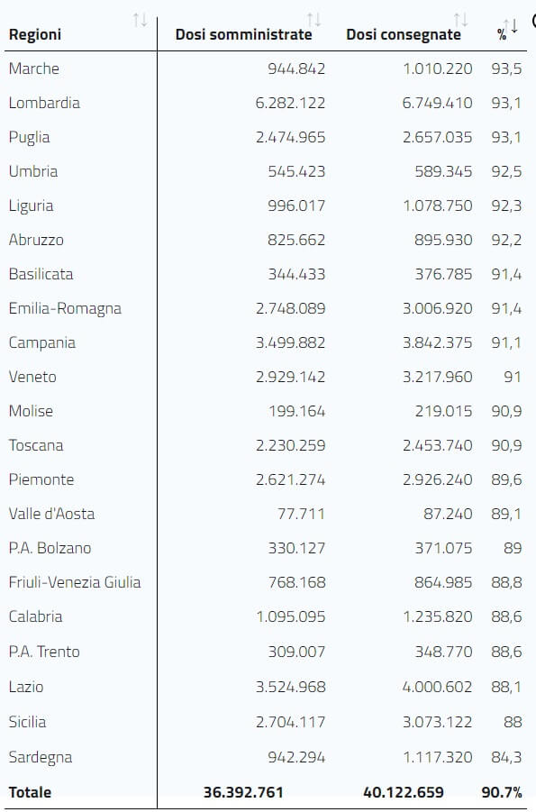 Per fasce d’età, gli Over 80 ad aver ricevuto almeno una somministrazione sono il 97,9%; i 70-79 sono l’86,6%; i 60-69 sono il 79%; i 50-59 sono il 52,4%; i 40-49 sono il 20,1%. I disabili coperti con almeno una dose sono il 75,4%, i vulnerabili il 74,5%.