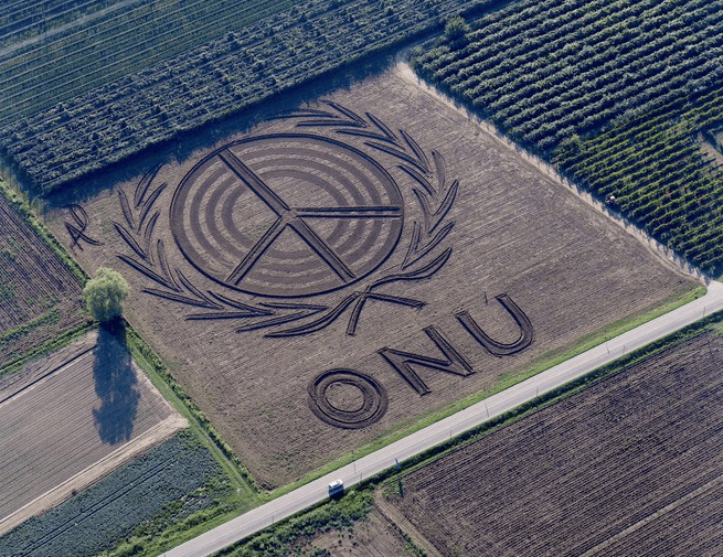 Un gigantesco emblema dell’Onu con all’interno l’ipsilon greca simbolo della pace. Così l’artista Dario Gambarin ha voluto ‘ridisegnare’ l’emblema delle Nazioni Unite, nella fase di tensione per le minacce nucleari nord coreane. Il simbolo dell’Onu in veste pacifista è diventato una mega opera di land art, tracciata con il trattore e l’aratro su un campo agricolo di 27mila metri quadrati a Castagnaro, in provincia di Verona. L’opera, pensata da Gambarin in occasione del 72/o anniversario di fondazione dell’organizzazione del palazzo di vetro, che si terrà il 24 ottobre, è stata eseguita senza disegno preparatorio, a ‘mano libera’ sul terreno. “Ho inserito il celebre disegno che simboleggia la pace al posto di quello delle Nazioni – ha detto Gambarin – per richiamare l’attenzione su quello che deve essere il ruolo dell’Onu: risolvere diplomaticamente i problemi che stanno tenendo il mondo con il fiato sospeso, risistemando gli equilibri internazionali, in primis la questione Nord Corea”.